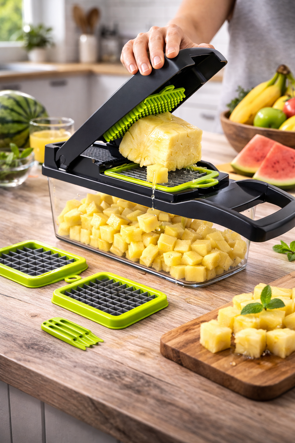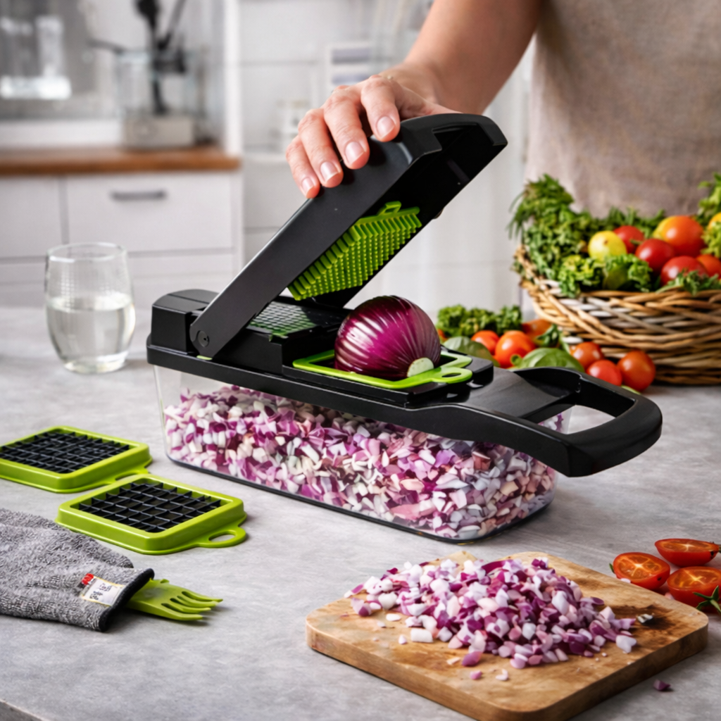 Er hilft dir dabei, Zutaten schnell, sauber und gleichmäßig zu schneiden, zu würfeln oder zu zerkleinern – damit du dir das Kochen endlich einfacher machen kannst.